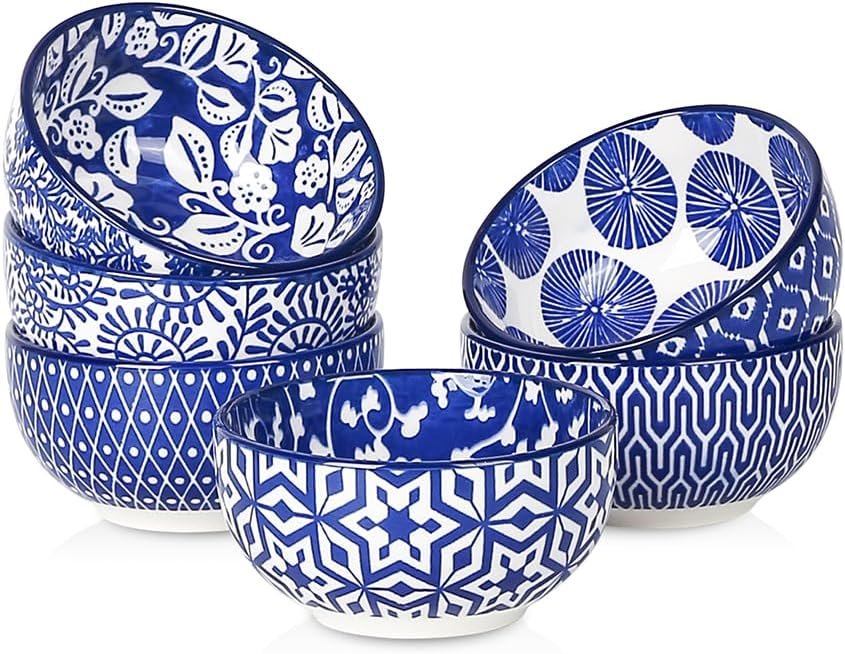 About this item MULTI-PURPOSE SMALL BOWLS – These 4 oz little snack bowls measure 3.5″ * 1.6″ inches, which is the right size for individual servings to hold small portions of ice cream, yogurt, snack, dessert, dipping sces, meal prepping, fruit, side dishes, and anything you like. They are very suitable for little hands and portion control.DELICATE DESIGN – With the design of exquisite and various blue patterns inside and outside, each bowl looks unique, stylish, and elegant which makes you cheerful. This outstanding design will match well your delicious food and add colors to a simple table decor.STURDY & CONVENIENT TO USE – These mini bowls feature the perfect thickness to ensure their strength and durability. Their appropriate weight and compact size give you comfort in use. Safely used in the Dishwasher, Microwave, Oven, and Freezer.EASY TO CLEAN & SAVE SPACE – These dipping bowls are made of premium Lead-free & Non-toxic glaze. Its smooth finish resists sticking to make them clean easily. The lightly curved side and width make storage a breeze and free up more cabinet space.GORGEOUS GIFT – The classic blue color and stylish design make them eye-catching! That would be a perfect gift for your friends and family at Housewarming, Weddings, Thanksgiving, Christmas, etc.